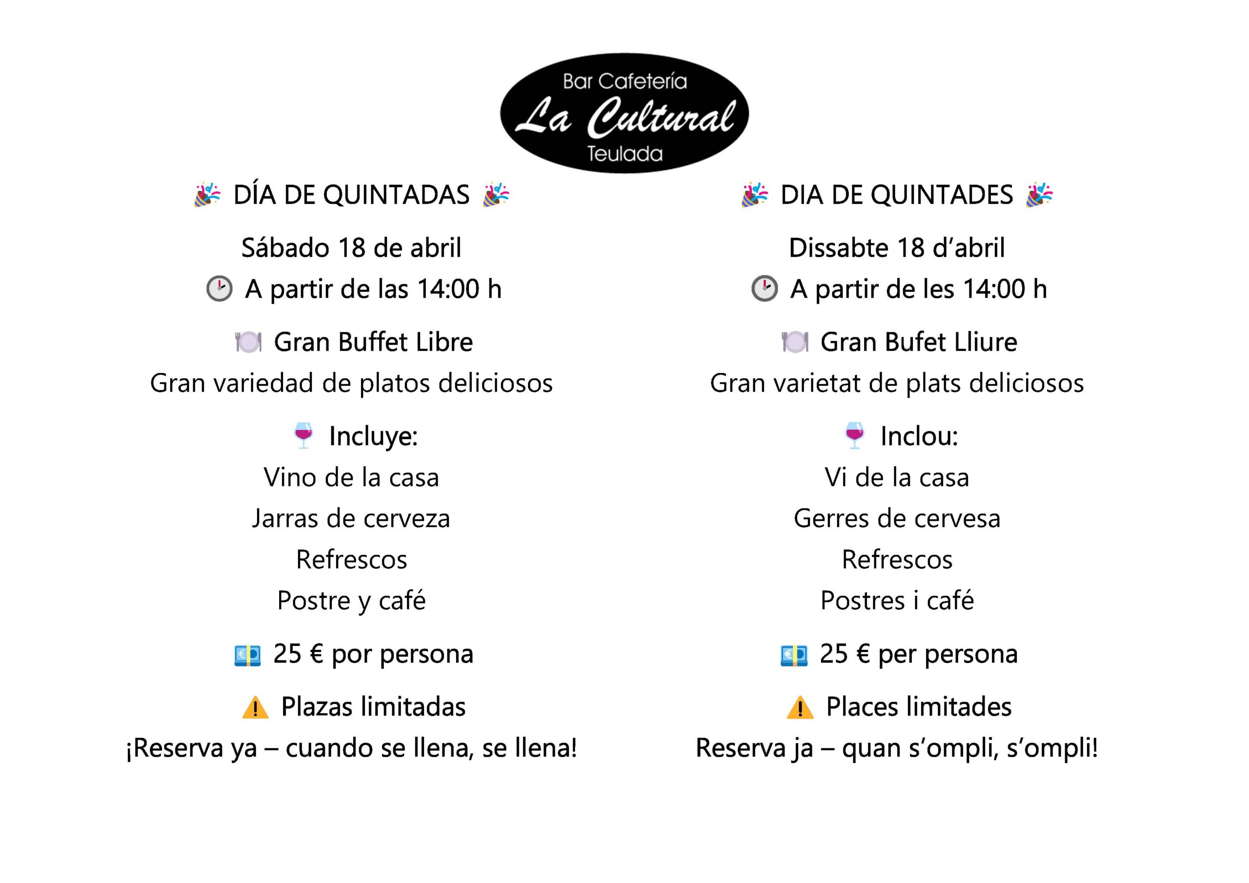 El sábado 18 de abril 2026, a partir de las 14:00 h, te invitamos a disfrutar de una comida especial con motivo del Día de Quintadas. Hemos preparado un gran buffet libre con una amplia selección de platos deliciosos para que pruebes y repitas todo lo que te apetezca.
